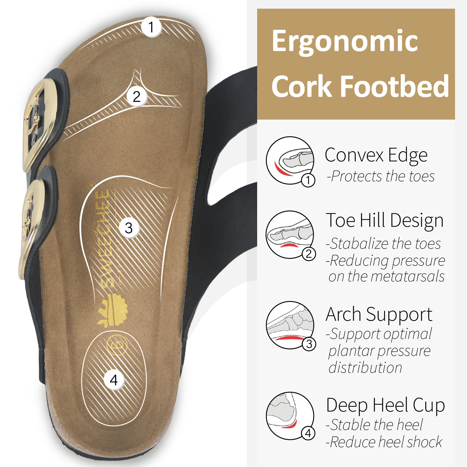 • Ergonomic cushioned Footbed: Sweechee redefines the women’s orthopedic sandal with a luxuriously soft yet supportive contoured footbed. Infused with extra memory foam padding, Sweechee's comfortable walking sandals ensuring each step is a cushioned delight.
